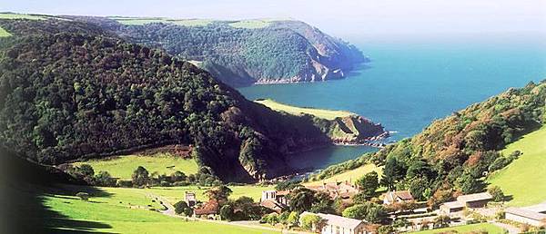 放眼望去,一大片翠綠色的草地上,紫色的石楠,金黃色的金雀花,綠色的羊齒、及一些不知名的野花,很有層次的覆蓋在上面,組合成拼布一般的圖畫,還有碧波蕩漾的布里斯托海峽在遠處閃耀。
